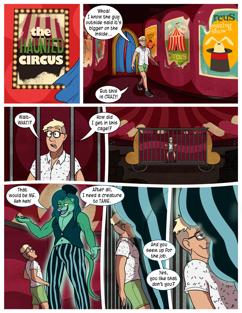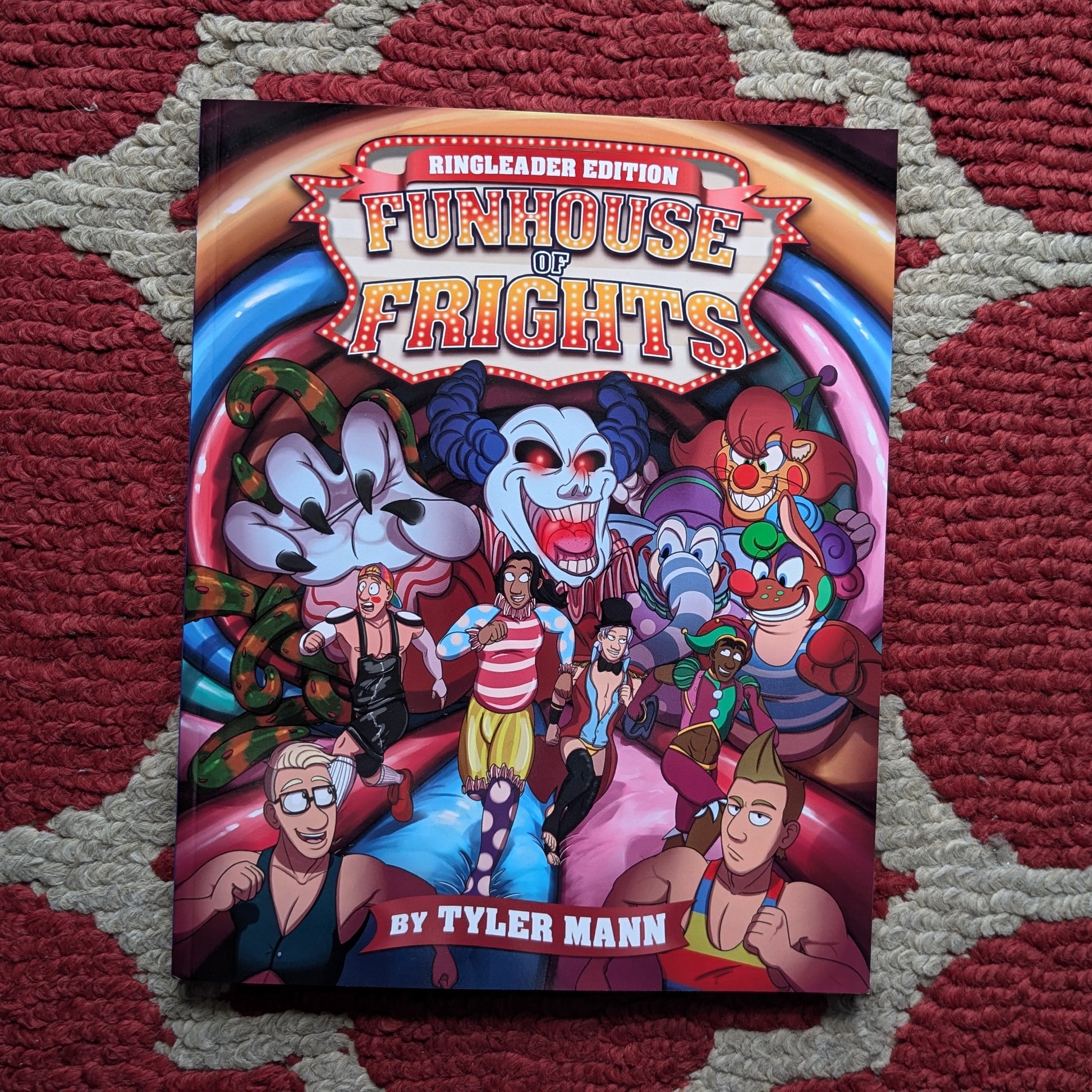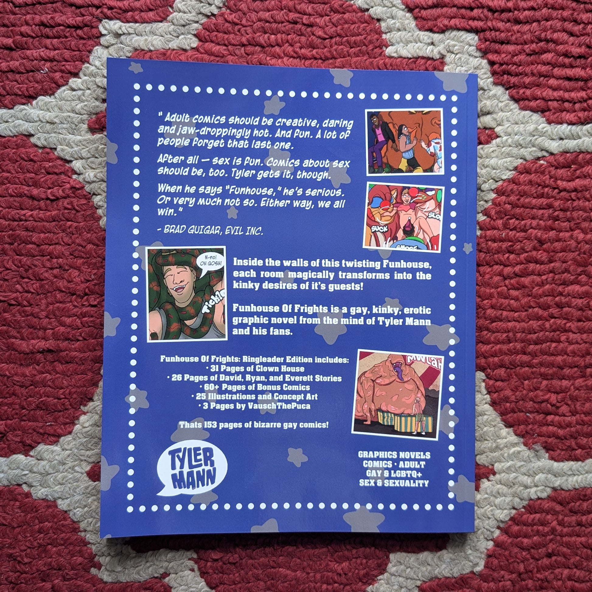 Inside the walls of this twisting Funhouse, each room magically transforms into the kinky desires of it’s guests! From ravenous demons to legally distinct Beast Masters, anything can be conjured for the lucky ticket holders! Funhouse Of Frights is a gay, kinky, erotic graphic novel from the mind of Tyler Mann, background artist Rosangela Ludovico, and friends.