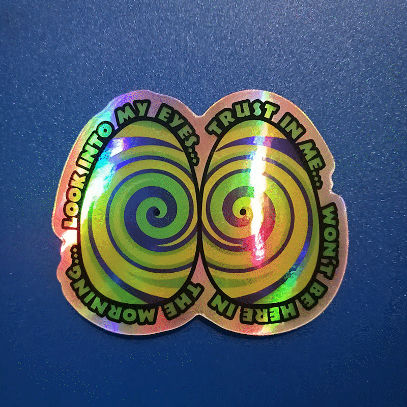 A familiar set of eyes lures you in with their hypnotic gaze. This sticker has a rainbow effect which changes with light and perspective.