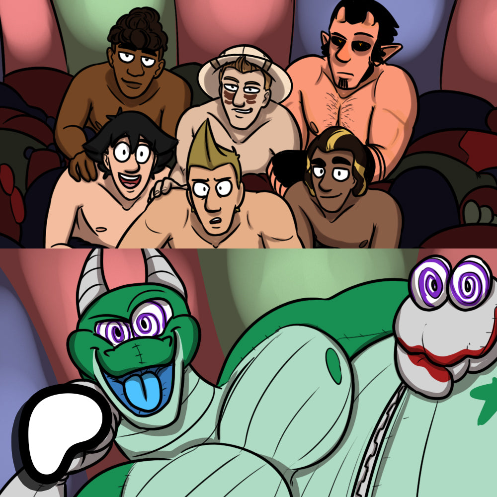 In this special Build-A-Pred comic, characters from all my comics meet Smooshu, a plush dragon with the unique ability to hypnotize and vore multiple prey through his maw, pouch, or even the sock puppets on both his paws.