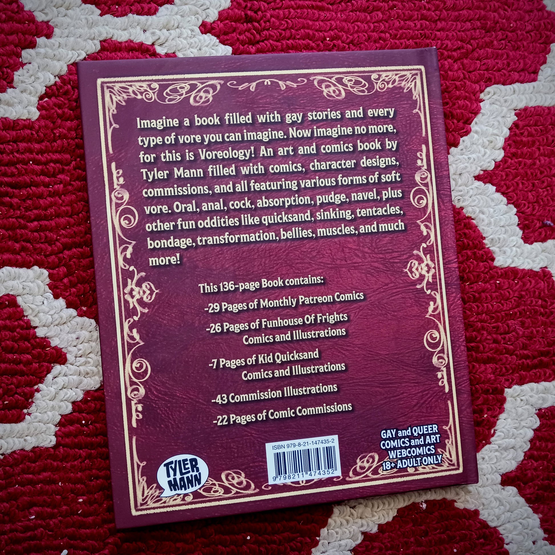 Imagine a book filled with gay stories and every type of vore you can imagine. Now imagine no more, for this is Voreology! An art and comics book by Tyler Mann filled with comics, character designs, commissions, and all featuring various forms of soft vore. Oral, anal, cock, absorption, pudge, navel, plus other fun oddities like quicksand, sinking, tentacles, bondage, transformation, bellies, muscles, and much more!